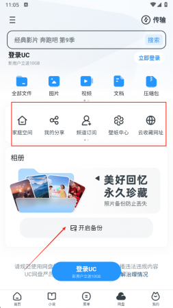 3、进入网盘页面,可使用搜索功能查找文件,也能通过全部文件,图片等分类查看对应文件,还能点击开启备份,对相册等内容进行备份,同时也可使用家庭空间,我的分享等功能。