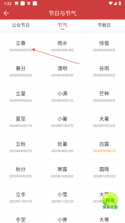 2、点击节日节气进入节日与节气界面,点击上方节气选项卡,界面会展示全年二十四节气以及对应的日期。