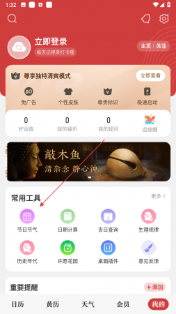 1、打开中华万年历应用,点击底部导航栏中的我的选项,进入个人中心页面,在常用工具板块找到节日节气选项。