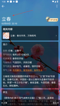 3、在节气列表中,点击想要查看详细信息的节气,比如立春,进入该节气的详情页,可查看节气具体时间,还能了解节气的别称、代表寓意、气候特点、节气养生等内容。