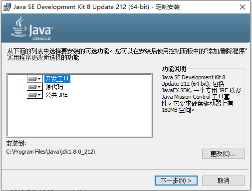 3.点击更改按钮选择安装路径,选择不带中文的路径。也可以用默认的路径,反正jdk占内存也不大,嘿嘿。