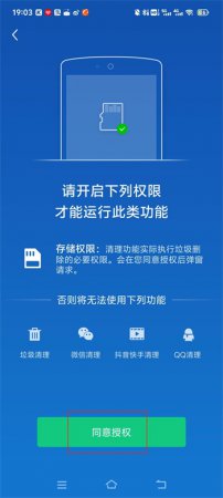 2、随后就会需要让你同意软件的权限管理,可以更加深入的对手机进行清除,点击下面的【同意授权】进行授权;