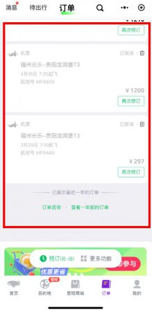 3、在订单页面中,就能查看各类订单记录,如机票订单等,还可进行再次预订等操作。