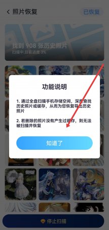 3、在弹出的功能说明弹窗中点击知道了,系统将全盘扫描手机存储空间查找删掉的历史照片,后续选取自己需要恢复的照片。