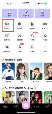 1、在美颜相机APP首页,找到并点击苹果模式,进入对应拍摄界面。