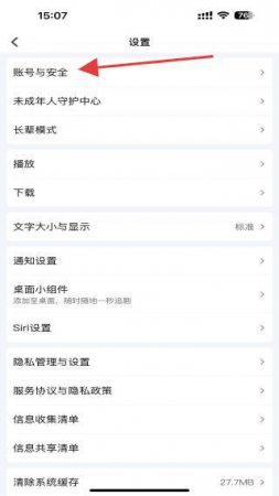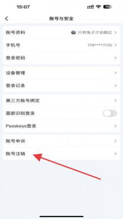 4、在账号与安全下,找到账号注销的功能按钮并点击。