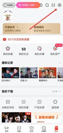 1、打开乐视视频APP,点击底部导航栏的我的,在个人中心页面的右上角,找到并点击设置图标。