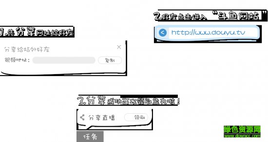 分享:1、先分享视频地址给好友,2、好友点击进入“斗鱼网站”3、分享成功可以领取鱼丸啦!您每邀请一个好友进入就可以获得10个鱼丸哦(每个好友只记一次哦)
