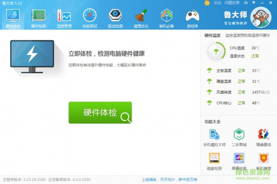 2.“鲁大师”能定时扫描您的计算机的安全情况,为您提供安全报告,有相关的资料的悬浮窗,可以显示“cpu温度”、“风扇转速”、“硬盘温度”、“主板温度、“显卡温度”等。会到微软官方网站为您下载安装最适合您的机器的漏洞补丁。“鲁大师”只会安装您的机器需要升级的漏洞补丁,并支持下载同时安装,大幅提高补丁安装速度,节省热门软件推荐安装您的等待时间。