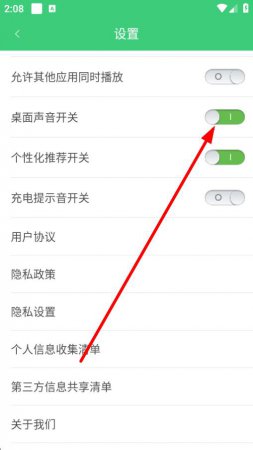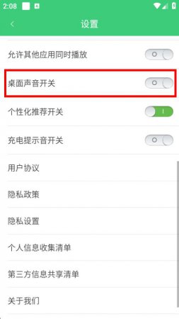 3、在设置界面里找到桌面声音开关选项,其右侧有开关按钮。