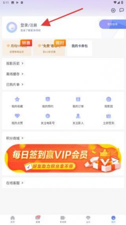2、在我的页面顶部,找到并点击登录/注册按钮即可弹出登录的弹窗。