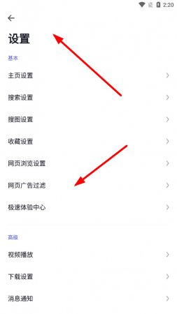 1、打开360极速浏览器,进入设置页面,点击网页广告过滤。