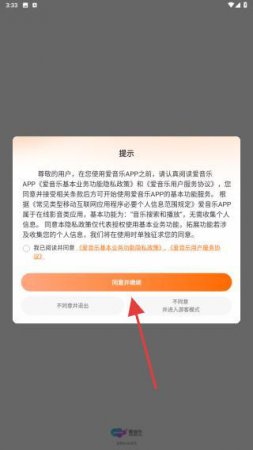 1、打开爱音乐APP,一进入会弹出提示,仔细阅读后点击同意并继续。