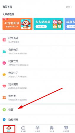 1、打开儿歌多多app点击底部中的我的选项,在我的页面里下滑找到设置的选项并点击。