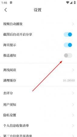 4、点击推送通知右侧的按钮,将其变为灰色关闭状态,完成推送通知的关闭操作。