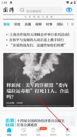1、打开澎湃新闻App,点击底部导航栏最右侧我的选项,进入个人页面。