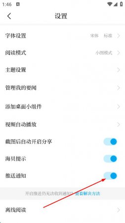 3、在设置界面内,向下滑动找到推送通知选项,此时其右侧按钮为蓝色开启状态。