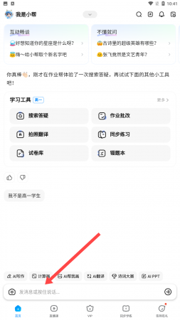 2、进入App首页后,有两种方式进行搜题其一,点击底部输入框,发消息或按住说话,说出题目内容进行语音搜题。