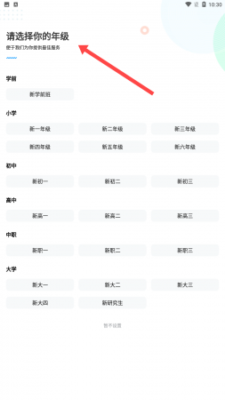 1、注册登入打开作业帮App,进入请选择你的年级页面,按自身情况选择对应的年级,方便提供适配的学习内容和服务。