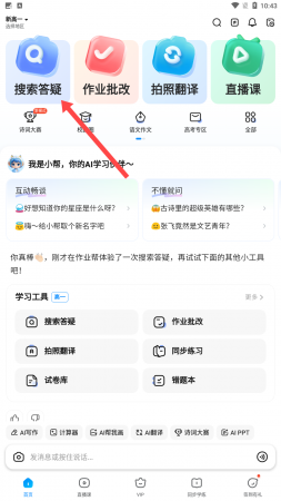 3、其二点击首页上方的搜索答疑按钮,还能选择拍照搜题,直接拍摄题目获取答案和解析。