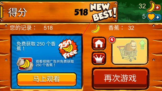 3、当在跑酷中持续收集香蕉、灵活使用道具避开所有障碍,成功突破当前关卡,即可解锁新场景,用隐藏关卡获得的装饰装扮小屋与金刚,开启新挑战。