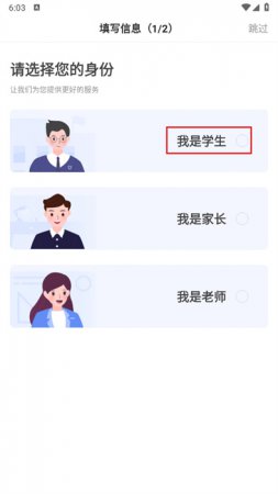 1、进入到应用之中后,用户可以根据自己的身份来进行选项的选择,小编将以【我是学生】按钮来进行演示;