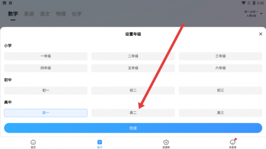 3、在设置年级界面,选择高中板块下的高二选项,点击下方完成按钮,完成年级重新设置,更新学习内容适配。