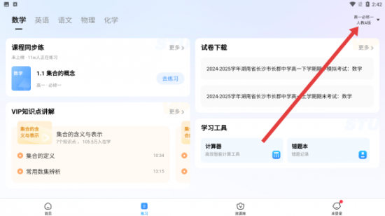 2、在练习页面右上角,点击个人设置区域的年级选择入口,进入设置年级界面,准备调整学习年级。