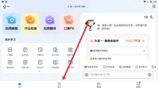 1、在APP首页点击底部练习按钮,进入学科练习模块,可查看课程同步练、VIP知识点讲解等学习内容,开启针对性练习。