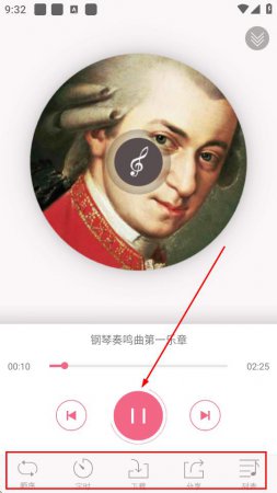 4、进入音乐播放页面,可进行暂停/播放操作,还能使用顺序播放、定时、下载、分享等功能。