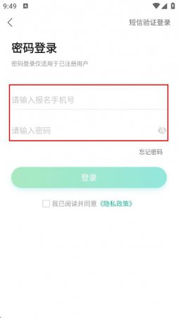3、在登录界面,选择“密码登录”,输入报名手机号和密码。