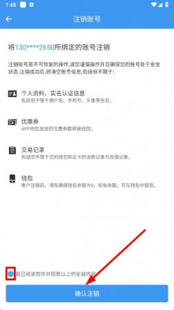4、在注销账号说明界面,勾选同意相关内容的选项框后,点击确认注销按钮完成账号注销。