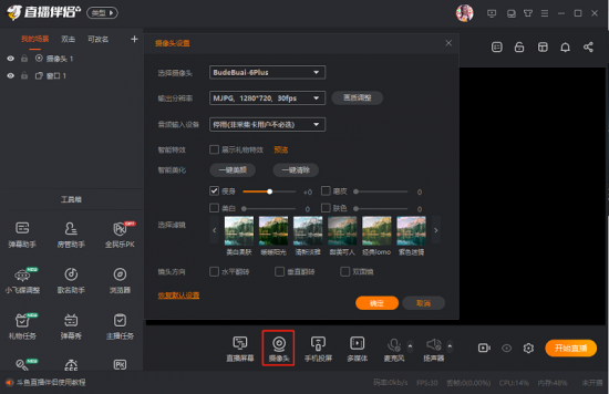 摄像头可以选择已连接的摄像头设备,并且也支持添加第三方如YY伴侣的虚拟摄像头