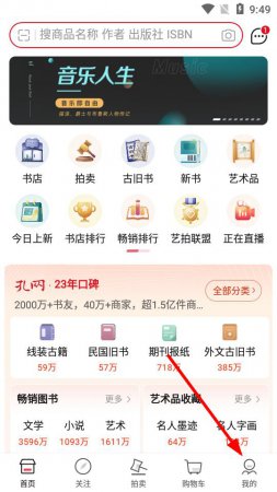 1、打开孔夫子旧书网app,点击底部导航栏最右侧我的选项。