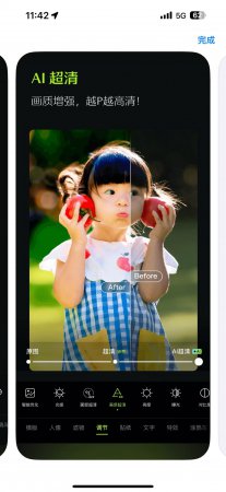 3、在编辑页,利用AI超清、智能优化等工具,通过调节面板调整画质、光感等参数,完成后点击完成保存或分享作品,轻松修图创作。