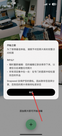 1、首次打开Snapseed,在权限提示框点击继续,授予照片库访问权限,以便完整使用功能。