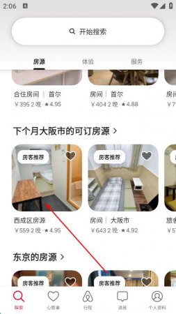 1、打开爱彼迎App,在探索页面中,找到你感兴趣的房源,点击进入。