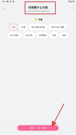 3、在你想看什么内容页面,选择具体内容类型,确认后点击底部选好了,进入首页按钮,即可进入哔哩哔哩首页。