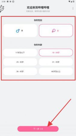 1、在欢迎来到哔哩哔哩页面,选择性别和年龄,点击底部粉色下一步的按钮。