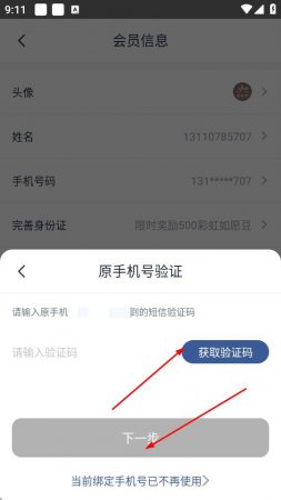4、在原手机号验证页面,点击获取验证码,输入收到的验证码后,点击下一步。