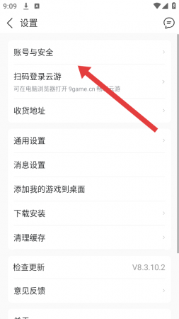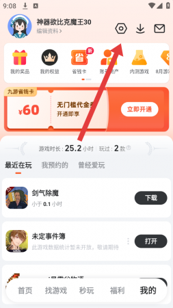 1、进入九游我的页面后,点击右上角齿轮形状的设置图标,进入设置的界面。