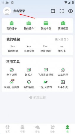 3、进入“我”的页面,页面有“我的订单”“我的证件”等功能入口,还有“点击登录”提示,点击“点击登录”字样。