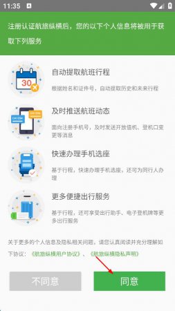 1、打开航旅纵横,进入个人信息使用服务说明界面,界面展示了自动提取航班行程、及时推送航班动态等服务,点击“同意”按钮。