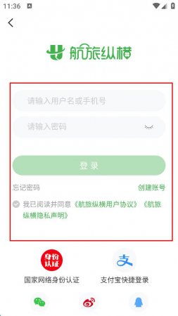 4、进入登录界面,可输入用户名或手机号、密码登录,输入用户名或手机号,输入密码,勾选已阅读并同意航旅纵横用户协议和航旅纵横隐私声明,点击“登录”按钮即可。