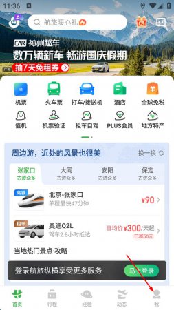 2、进入航旅纵横主界面,界面有“机票”“火车票”等功能选项,还有周边游推荐,点击界面下方“我”的选项。