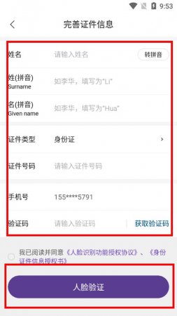 4、在完善证件信息界面,依次填写信息,填写完成后获取并输入验证码,勾选同意相关协议后点击人脸验证,按提示完成实名认证操作。