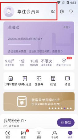 2、在会员界面,点击华住会员区域进入我的账户界面。