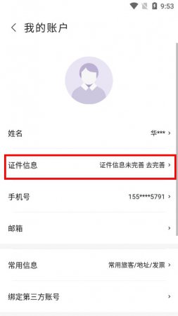 3、在我的账户界面中找到证件信息栏,点击去完善进入完善证件信息界面。