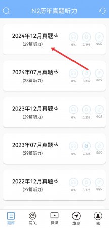 1、在N2历年真题听力页面,点击目标年份真题,进入真题的试题分类页面。