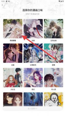 2、在选择漫画口味的页面,可以进行定制个性内容,至少选择1个,也可以点击多个不同的类型。